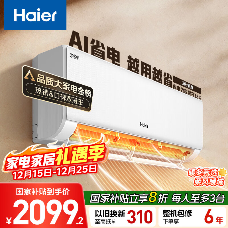 海尔净省电空调 1.5匹 一级能效变频 冷暖两用 壁挂式空调 卧室挂机 国家补贴 以旧换新KFR-35GW/E1-1